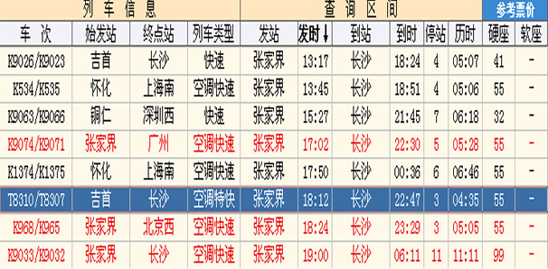 【始发站:张家界     到站:长沙】 适合当日下午17:00左右已到达张家界市区的旅客。